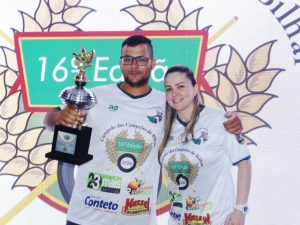 Gabriel recebeu o troféu de vice campeão das mãos da parceira Camila (Bilhares Renascer)